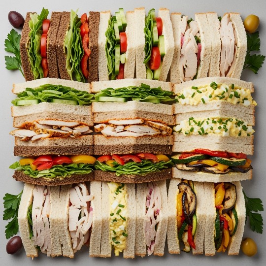 One round consists of 2 slices of bread filled with one of our delicious gourmet fillings, and cut into 4 triangles. We recommend 1.5 rounds per person